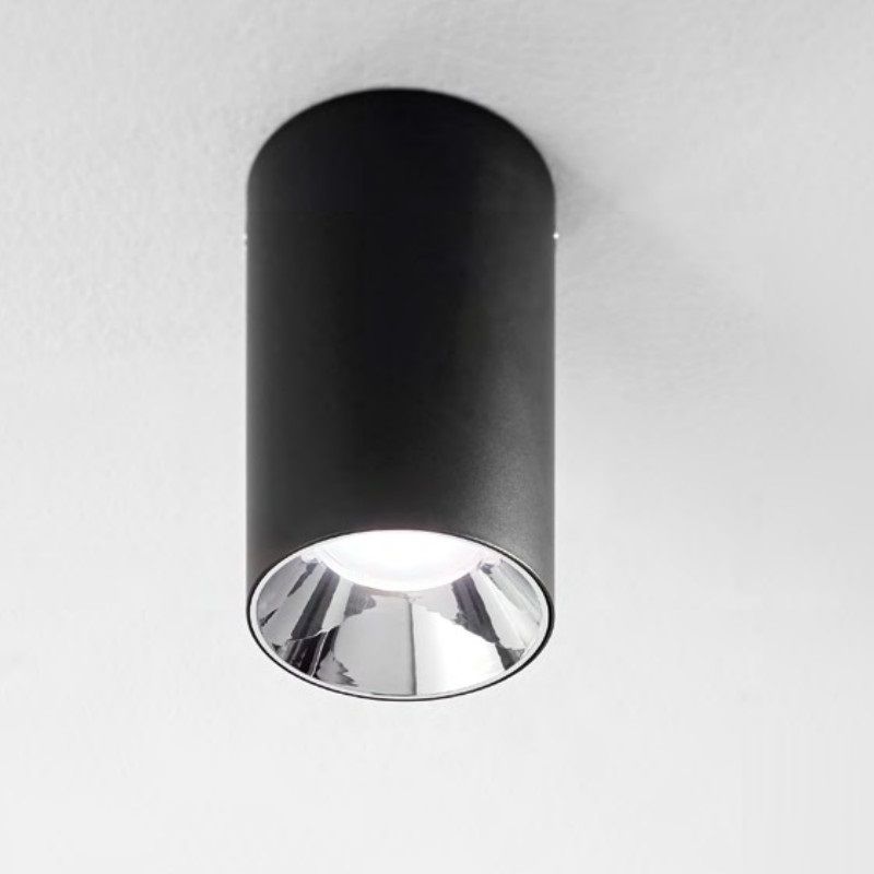 Faretto cilindrico in alluminio, montaggio in aderenza con staffetta in metallo per cartongesso o laterizio, nero satinato con riflettore cromato.