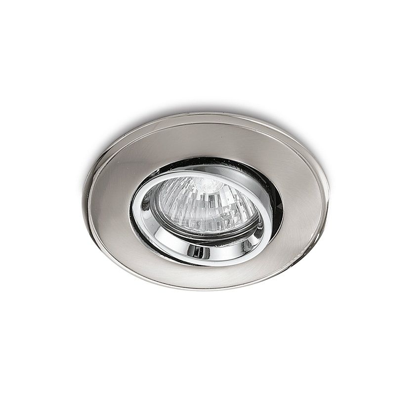 Faretto da incasso orientabile tondo. Struttura in alluminio, finitura nichel spazzolato e cromo.