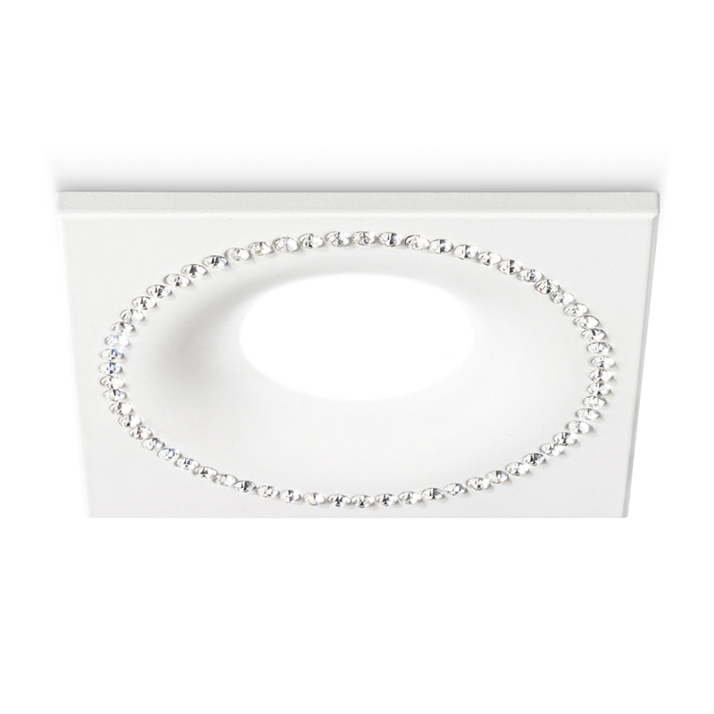 Faretto da incasso quadrato. Struttura in alluminio, finitura bianco opaco con inserimento di strass di cristallo trasparente.