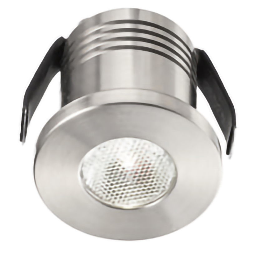 Faretto da incasso tondo a molle. Struttura e dissipatore in alluminio, finitura nichel.