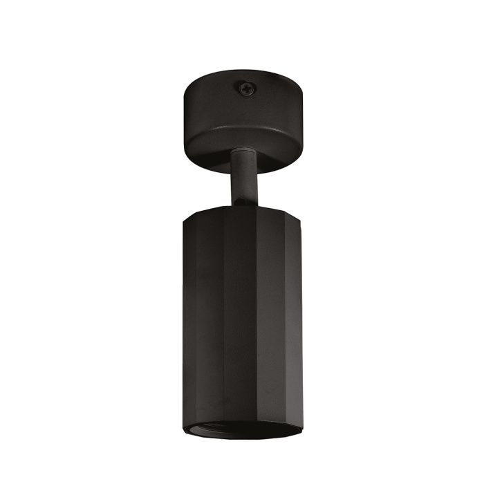 Faretto orientabile a 90° e girevole a 350°. Struttura cilindrica con superficie sfaccettata in alluminio e finitura di colore nero satinato.