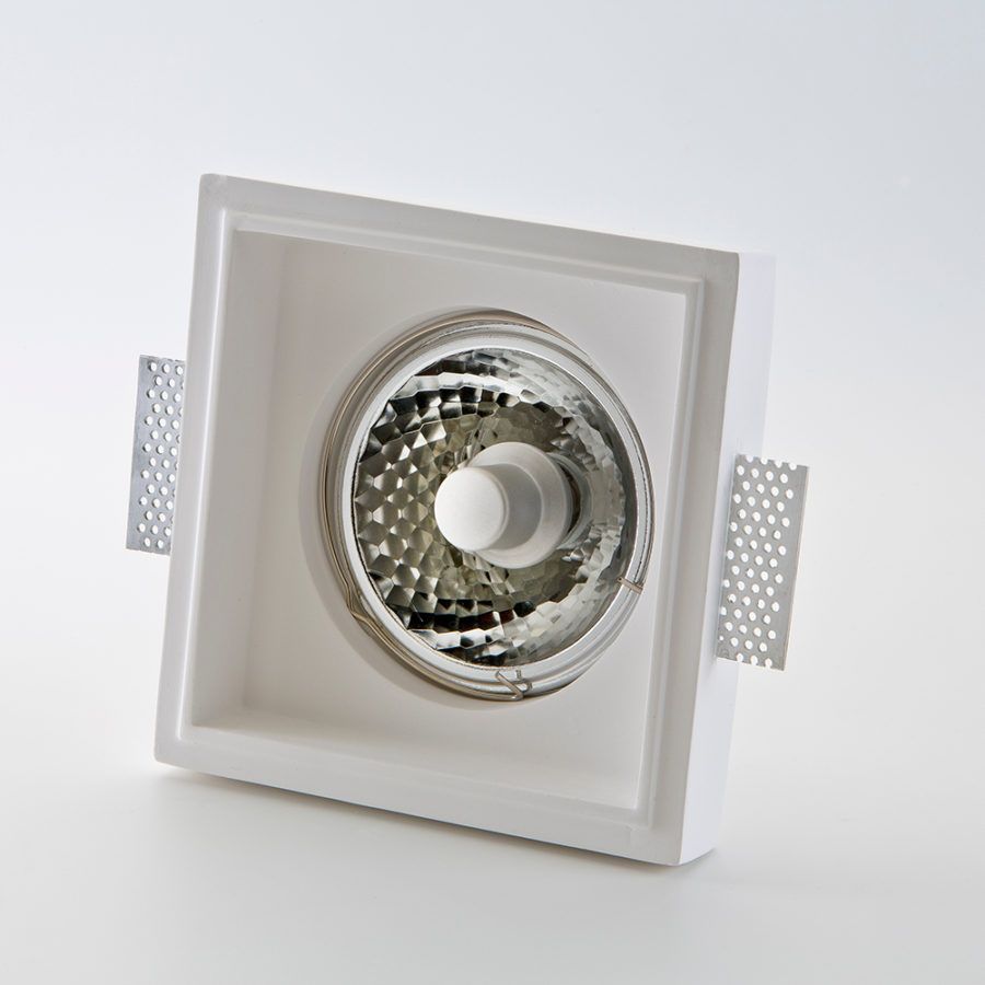 Faretto quadrato da incasso in gesso, montaggio incasso a scomparsa con staffe incorporate in alluminio per cartongesso da 9 a 15mm. Finitura bianco tinteggiabile.