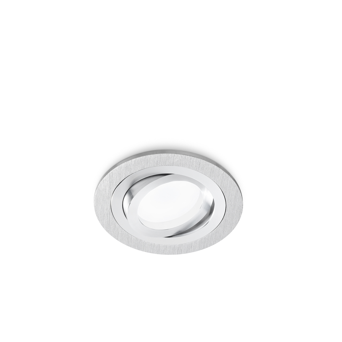 Faretto da incasso orientabile tondo. Struttura in alluminio, finitura alluminio spazzolato.