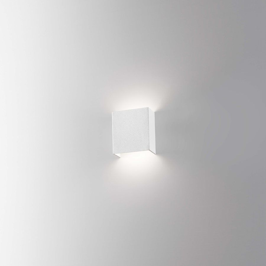 Lampada da parete in alluminio, montaggio in aderenza a parete tramite supporto in metallo, vernice epossidica bianco satinato.