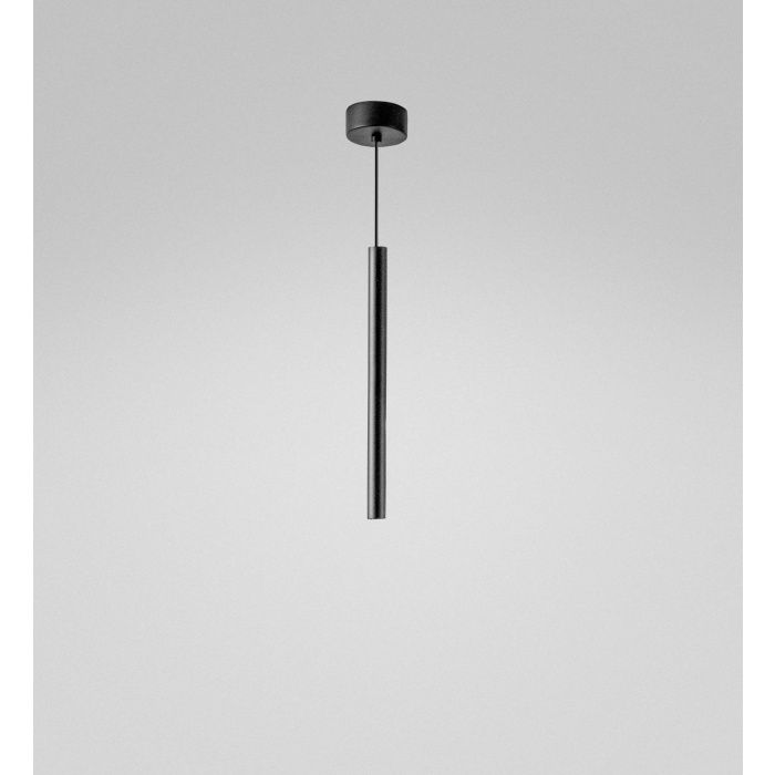 Sospensione con montatura in alluminio. Finitura di colore nero satinato e rosone nero satinato.