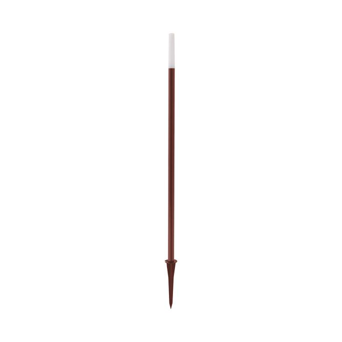 Paletto da giardino con struttura in alluminio dotato di picchetto per il fissaggio a terra. Finitura di colore marrone scuro e diffusore in metacrilato bianco opale.