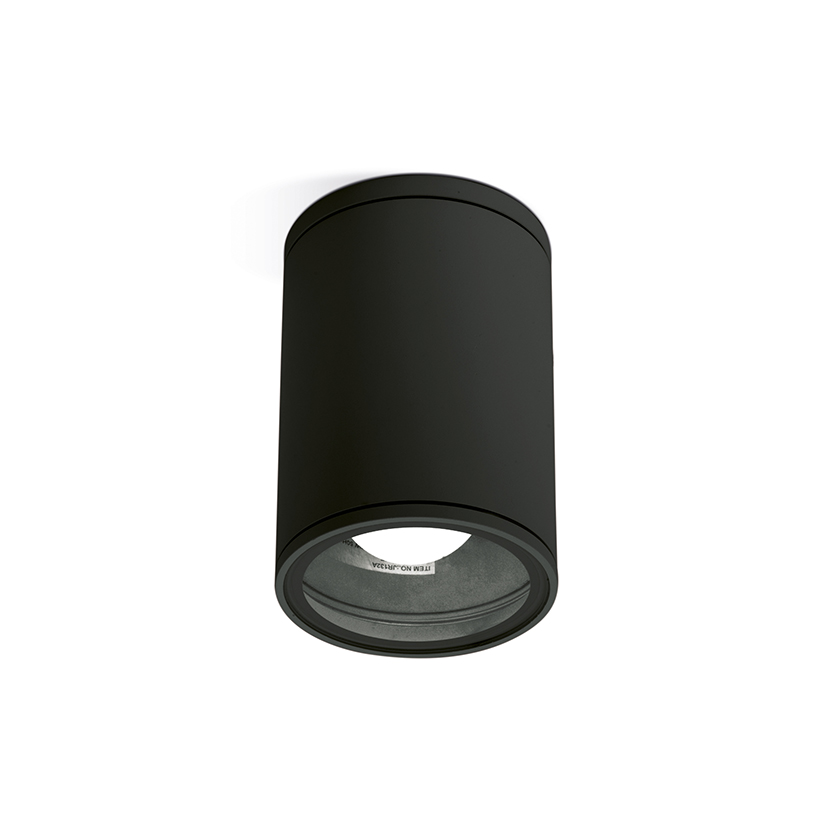 Plafoniera con struttura in alluminio pressofuso, finitura in grigio antracite, diffusore in vetro trasparente.