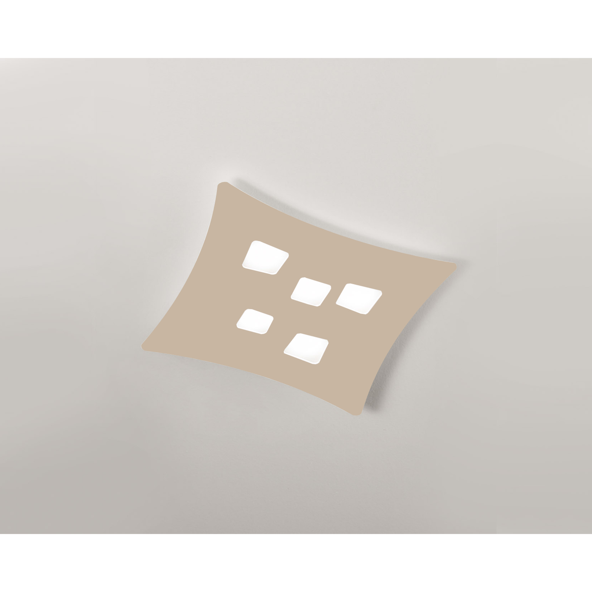 Plafoniera con montatura in metallo bianco con diffusore in metacrilato e alluminio con finitura tortora.
