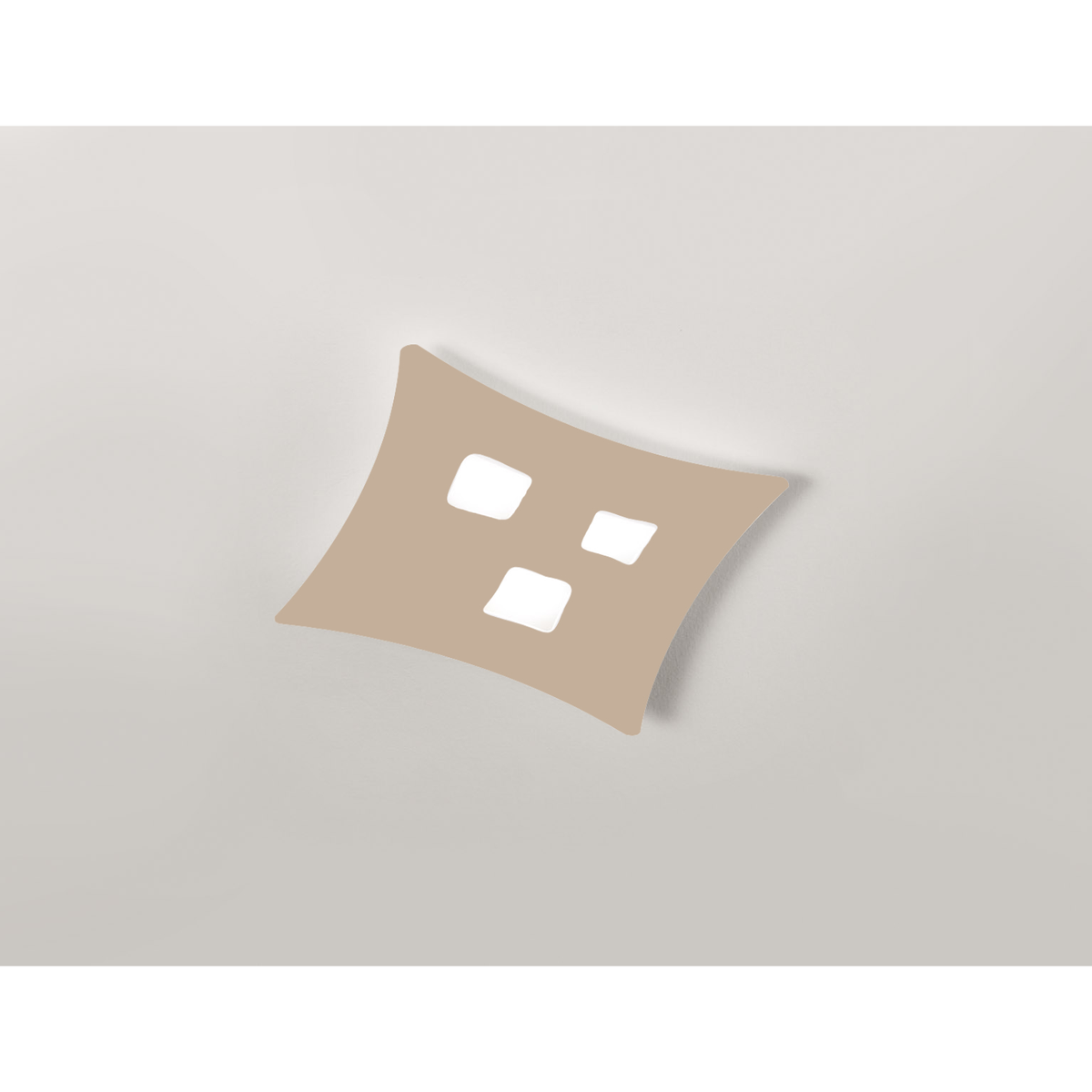 Plafoniera con montatura in metallo bianco con diffusore in metacrilato e alluminio con finitura tortora.