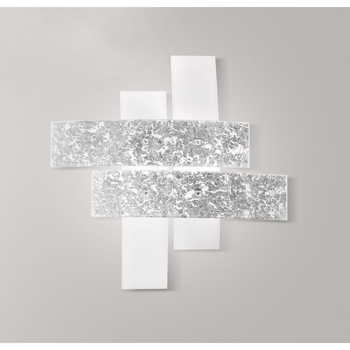 Plafoniera con montatura in metallo con finitura cromo. Diffusore in vetro bianco con particolari in foglia argento. Lampadina non inclusa.